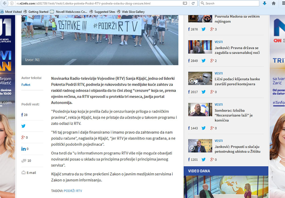 Takođe nešto više od sata kasnije, u 14.16 odnosno 14.36, na drugim medijima (RTS odnosnoN1, slike 3 i 4) vidimo vest agencije FoNet, u kojoj se izostavlja objašnjenje za otkaz. Kaže se samo da je jedna od čelnica pokreta Podržimo RTV, novinarka Sanja Kljajić dala otkaz zbog cenzure na RTV-u i dodaje da će se ona i dalje boriti za slobodu na tom javnom servisu.