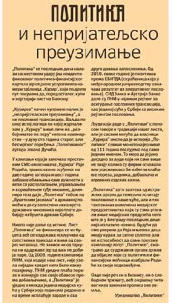 „U kampanji koja je započela prostačkim SMS-om osnivača ’Kurira’ Raje Rodića, pravosnažno osuđenog na dve godine zatvora i šest godina zabrane obavljanja svih dužnosti u vezi sa raspolaganjem, upravljanjem i korišćenjem tuđe imovine, dominira teza da je ’Politika’ tobož na ’budžetskim jaslama državne pomoći i da su zaposleni neka vrsta državnih činovnika koji plate dobijaju iz budžeta države Srbije’.”