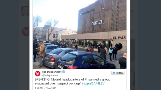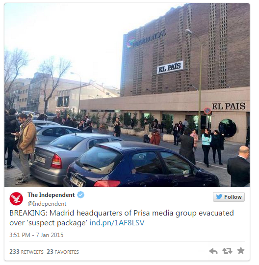Španska medijska kuća Prisa koja izdaje najčitaniji list u Španiji „El Pais“ evakuisala je danas svoje prostorije nakon što je dobila sumnjivu pošiljku. Kasnije utvrđeno da je uzbuna lažna