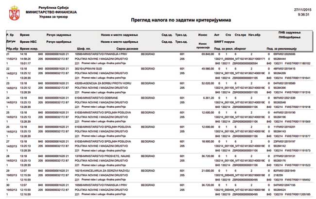 To je razlog što se naš list i zvanično obratio Upravi za trezor Ministarstva finansija zahtevajući spisak svih uplata budžetskih korisnika na račun naše medijske kuće od 2011. do 2015. godine. Podaci Trezora, koji su nam dostavljeni početkom nedelje, potvrdili su da gotovo sve te finansijske transakcije predstavljaju prodaju oglasnog prostora. Svi su zavedeni pod šifrom 221 koja označava promet roba i usluga što u ovom slučaju ne može da znači ,,sve i ništa“.