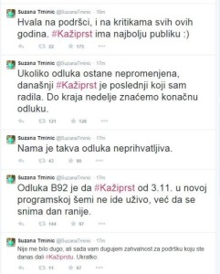 „Nije me bilo dugo, ali sada vam dugujem zahvalnost za podršku koju ste danas dali „Kažiprstu“. Ukratko: Odluka B92 je da „Kažiprst“ od 3. novembra u novoj programskoj šemi ne ide uživo, već da se snima dan ranije. Nama je takva odluka neprihvatljiva. Ukoliko odluka ostane nepromenjena, današnji „Kažiprst“ je poslednji koji sam radila. Do kraja nedelje znaćemo konačnu odluku. Hvala na podršci, i na kritikama svih ovih godina. „Kažiprst“ ima najbolju publiku“, napisala je Suzana Trninić.