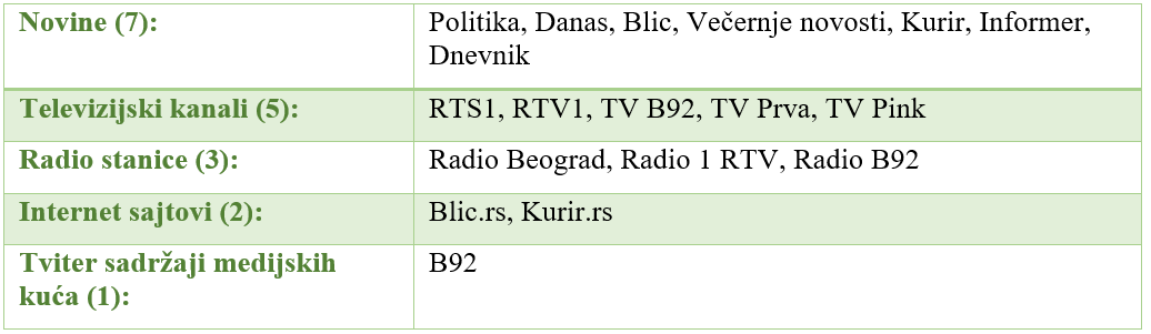 Medijski sistem u Srbiji je vrlo raznovrstan i prezasićen sa više od 1000 medija. Otud je vrlo teško izabrati ’reprezentativane medije’ a za ovu svrhu odabrani su mediji na osnovu nekoliko kriterijuma, među kojima su vrsta medija, vlasnički status, uređivačka politika, teritorijalno prostiranje/tiraž i uticaj. U analizu je bilo uključeno 18 informativnih medija.