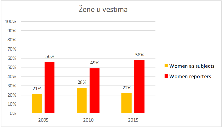 U monitoringu 2015 godine žene su činile 22% osoba čiji se glas čuje, o kojima se piše ili koje se vide u štampi, televizijskim i radijskim vestima.