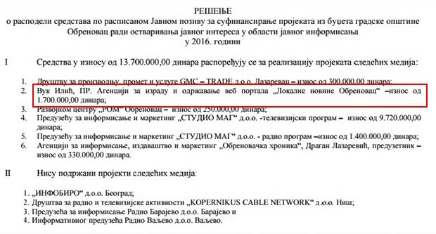 On je, prema pisanju dnevnih novina Kurir, 3. februara 2016. godine doneo rešenje za sufinansiranje projekata iz budžeta gradske opštine Obrenovac radi „ostvarivanja javnog interesa u oblasti javnog informisanja u 2016. godini“, na osnovu kog je Agencija za izradu i održavanje veb-portala Lokalne novine Obrenovac dobila 1,7 miliona dinara! Inače, Lokalne novine imaju relativno slabu posećenost, a najaktivnije su na Fejsbuku. Prilično je interesantno to što je taj portal registrovan tek 15. januara 2016. godine.