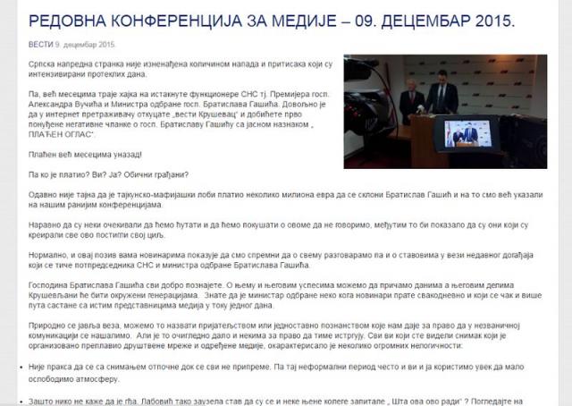 U arhivi sajta se vidi da je dosadašnja praksa kruševačkih naprednjaka da nakon svih redovnih konferencija za novinare na sajtu okače transkript, ali i video snimak sa konferencije.