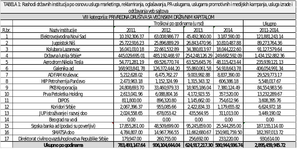 Savet je analizirao ukupno 124 državna organa, organizacije, fonda, javna preduzeća, privredna društva sa većinskim državnim kapitalom i organa lokalne samouprave. Gotovo 60 posto novca dato je za troškove oglašavanja u sredstvima javnog informisanja i troškove sponzorstava i donacija – po oko 1,9 milijardi dinara.