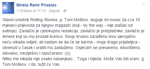 Mirela Remi Priselac, koja je prevodila tekstove za hrvatsko izdanje Rolling Stonea, 1. listopada o.g. je na svom Facebooku prozvala Tonija Moškova, optuživši ga za neisplaćeni honorar.