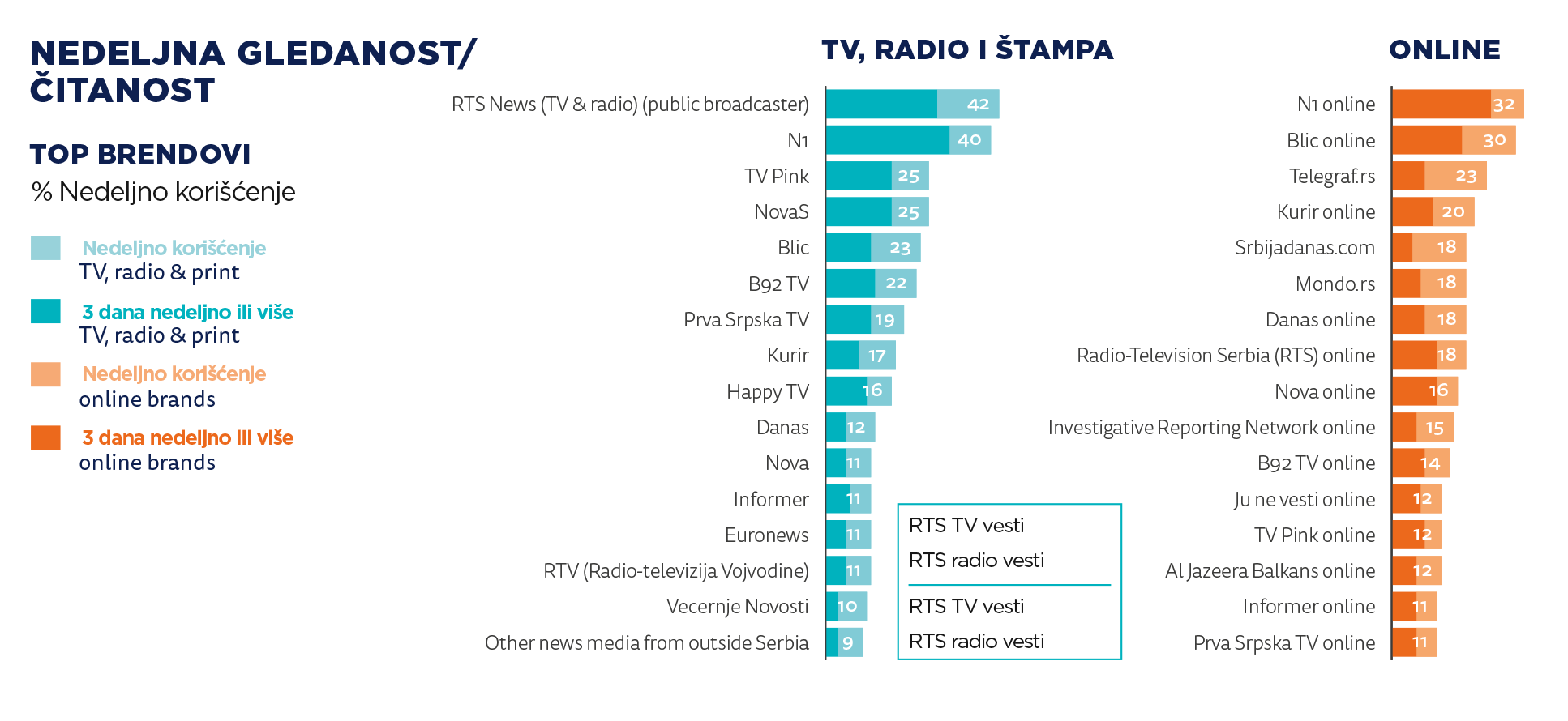 – RTS, N1 i TV Pink su među vodećim TV brendovima, dok portali N1 i Blic imaju najveći domet online. N1 je jedini glavi izvor vesti za najveći broj i publike.