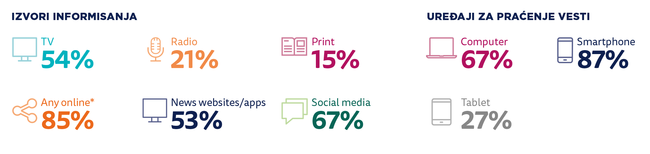 – TV je glavni izvor vesti za 54% publike, što je u skladu sa svetskim trendovima opadanja korišćenja i uticaja televizije koja je na globalnom nivou u poslednji 12 godina opala za 22%.