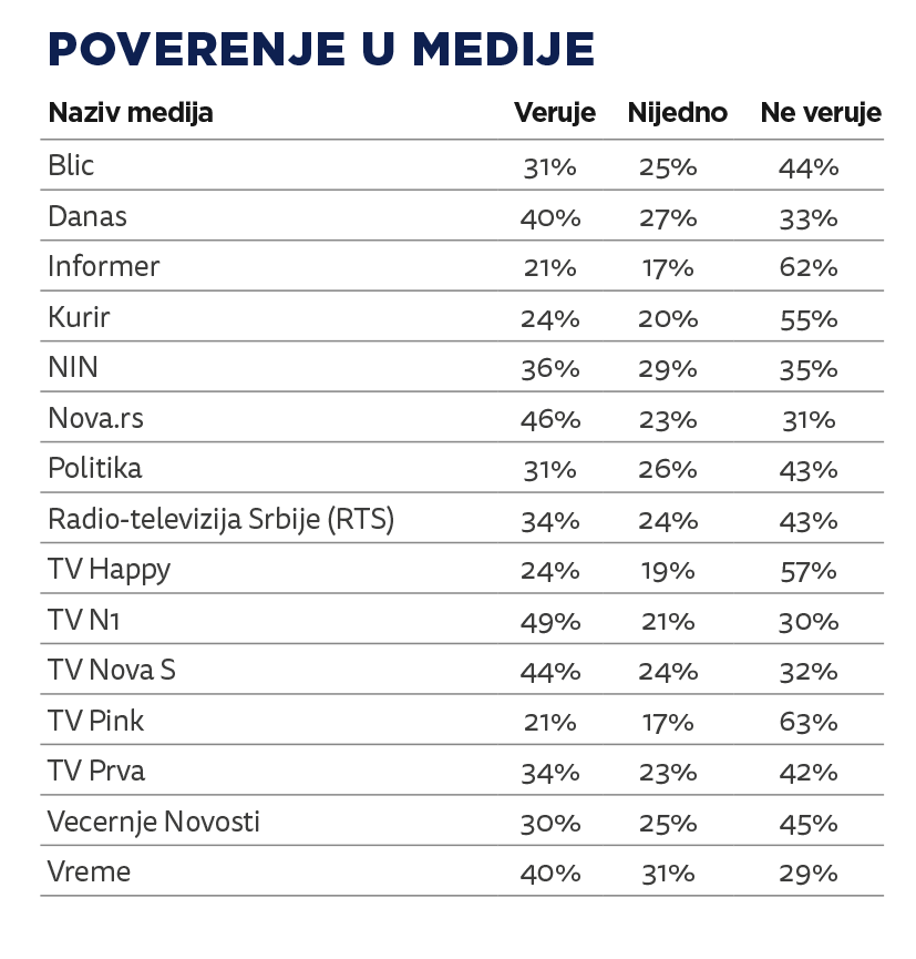 – Većini tradicionalnih medijskih brendova u Srbiji više se ne veruje nego što im se veruje. TV Pink, Informer, TV Happy i Kurir su mediji kojima se najmanje veruje, dok su N1, Nova.rs, TV Nova, Vreme i Danas mediji kojima se najviše veruje.
