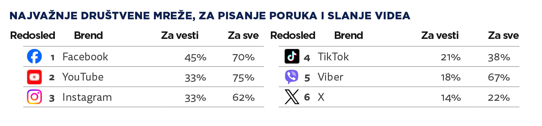 – Facebook (45%), YouTube (33%), Instagram (33%) i TikTok (21%) su mreže koje se najviše koriste za praćenje vesti.