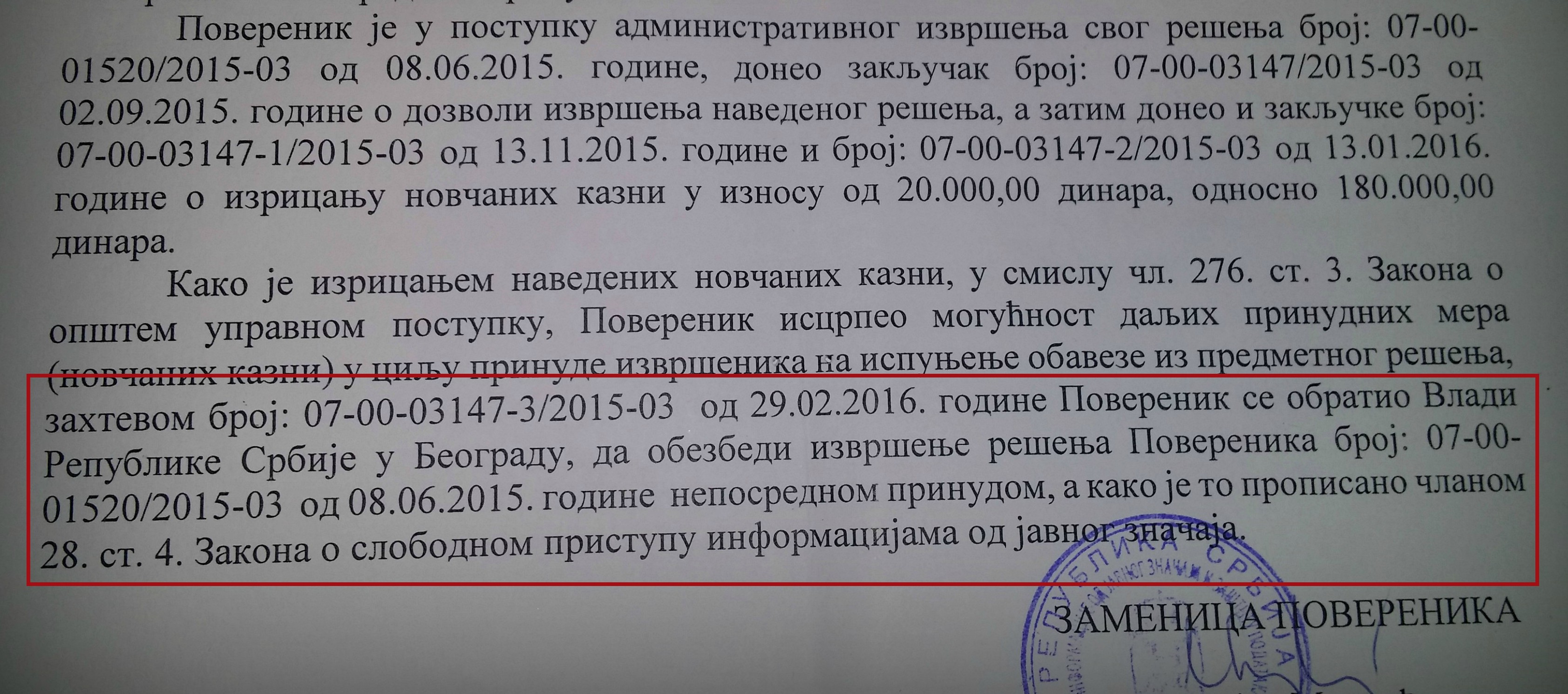 U dopisima koji su BIRN-u dostavljeni u petak, 4. marta 2016. godine, Poverenik navodi da se obratio Vladi Srbije, jer je prethodnim izricanjem novčanih kazni Ministarstvu pravde i Elektromreži (EMS) u ukupnom iznosu od po 200.000 dinara, iscrpeo sve zakonske mogućnosti kojima bi ih prinudio da ispune svoje obaveze iz Rešenja kojima im je Poverenik naložio dostavljanje informacija od javnog značaja.