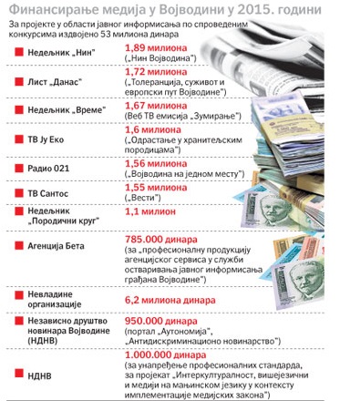 Pokrajina je prošle godine dala oko 53 miliona dinara za projekte u oblasti javnog informisanja, po sprovedenim konkursima. Veći deo tog novca, oko 30 miliona, Sekretarijat za kulturu i informisanje uplatio je privatnim preduzećima. Najviše je dobio nedeljnik „Nin” – 1,89 miliona („Nin Vojvodina”). Listu „Danas” isplaćeno je 1,72 miliona („Tolerancija, suživot i evropski put Vojvodine”), a nedeljniku „Vreme” 1,67 miliona (Veb TV emisija „Zumiranje”).
