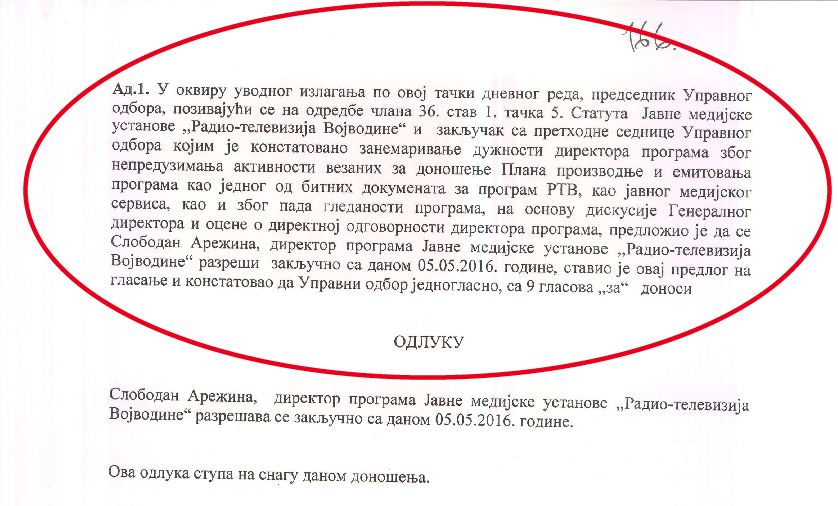 U zapisnicima sa sednica Upravnog odbora Radio-televizije Vojvodine vidi se kako je direktor programa RTV Slobodan Arežina smenjen u istom danu, na hitno sazvanoj sednici, 10 minuta pošto je na prethodnoj sednici raspravljano o njegovom radu pod tačkom „razno“. Arežina optužen da nema Plan proizvodnje i emitovanja, čije donošenje nije njegova obaveza